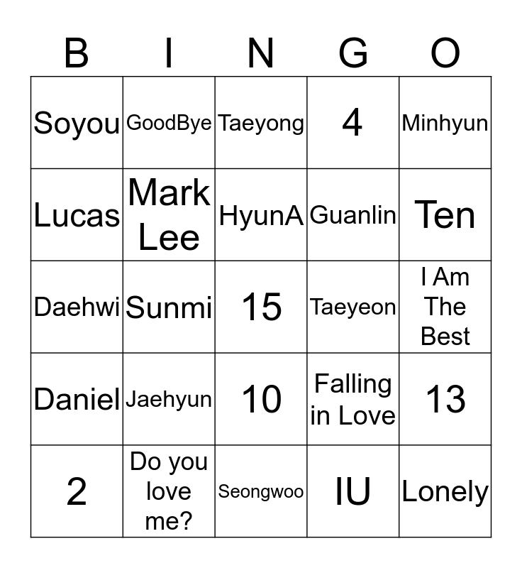 This bingo card has a free space and 24 words: Jaehyun, Do you love me?, HyunA, 2, Minhyun, Soyou, Lucas, GoodBye, Taeyeon, 10, Guanlin, Daehwi, Falling in Love, 13, Mark Lee, IU, I Am The Best, Taeyong, Ten, Sunmi, Lonely, Daniel, 4 and Seongwoo.