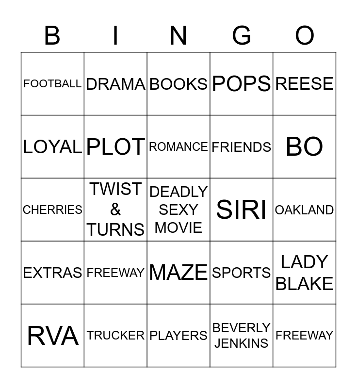 This bingo card has a free space and 32 words: BEVERLY JENKINS, IRIS BOLLING, TWIST & TURNS, CAST, EXTRAS, PLOT, REESE, LADY BLAKE, DRAMA, LOVE, ROMANCE, BOOKS, GRANDMA, BOBBY, SIRI, MOVIES, RVA, CHERRIES, MAZE, FREEWAY, SPORTS, AGENT, OAKLAND, TRUCKER, FREEWAY, POPS, FRIENDS, LOYAL, FOOTBALL, PLAYERS, MUSIC and BO.
