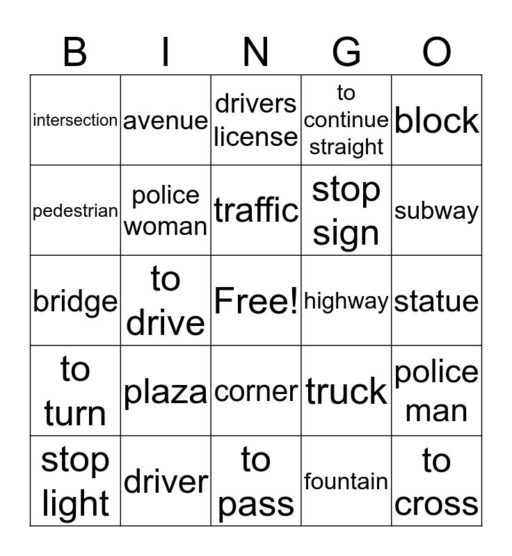 This bingo card has a free space and 24 words: plaza, driver, traffic, stop light, block, intersection, pedestrian, avenue, highway, corner, stop sign, bridge, truck, police man, police woman, fountain, statue, drivers license, subway, to drive, to cross, to turn, to continue straight and to pass.