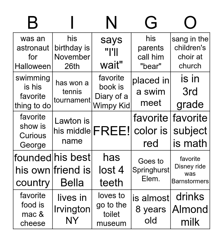 This bingo card has a free space and 24 words: his best friend is Bella, lives in Irvington NY, favorite book is Diary of a Wimpy Kid, favorite food is mac & cheese, sang in the children's choir at church, was an astronaut for Halloween, swimming is his favorite thing to do, his birthday is November 26th, favorite color is red, has lost 4 teeth, placed in a swim meet, favorite show is Curious George, Goes to Springhurst Elem., favorite Disney ride was Barnstormers, has won a tennis tournament, is almost 8 years old, favorite subject is math, says "I'll wait", is in 3rd grade, Lawton is his middle name, drinks Almond milk, founded his own country, his parents call him "bear" and loves to go to the toilet museum.