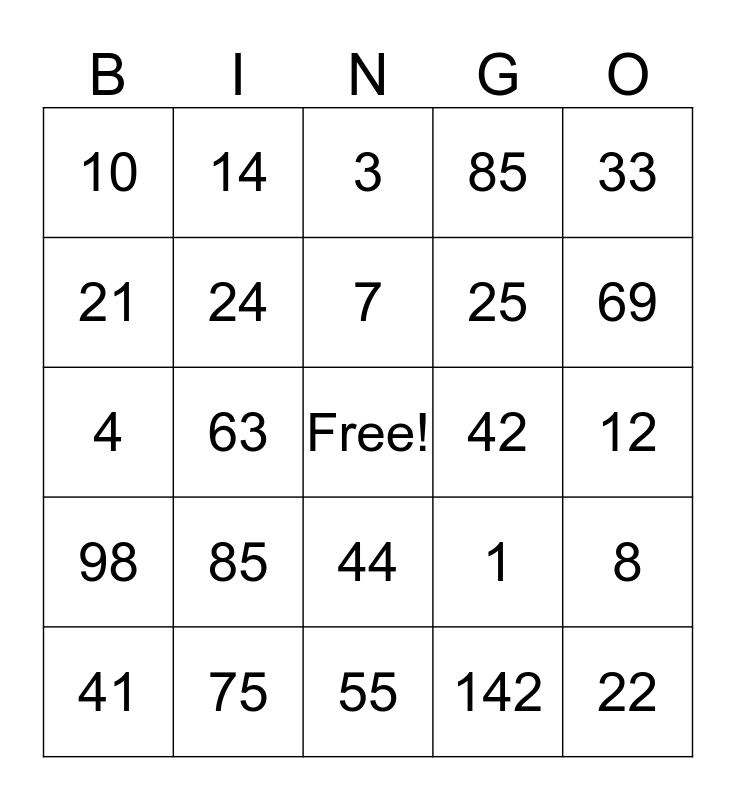 This bingo card has a free space and 24 words: 85, 75, 7, 41, 33, 10, 21, 14, 42, 44, 25, 4, 1, 8, 24, 142, 12, 3, 69, 63, 22, 98, 85 and 55.