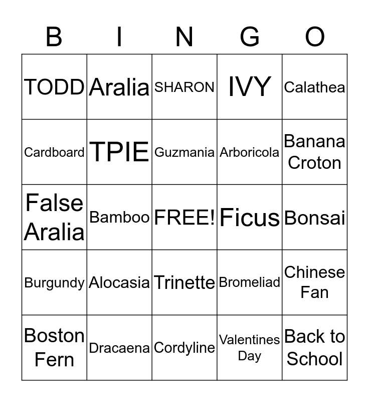 This bingo card has a free space and 24 words: Alocasia, Dracaena, Guzmania, Boston Fern, Calathea, TODD, Cardboard, Aralia, Ficus, Trinette, Arboricola, False Aralia, Bromeliad, Chinese Fan, TPIE, Valentines Day, Bonsai, SHARON, Banana Croton, Bamboo, Back to School, Burgundy, IVY and Cordyline.
