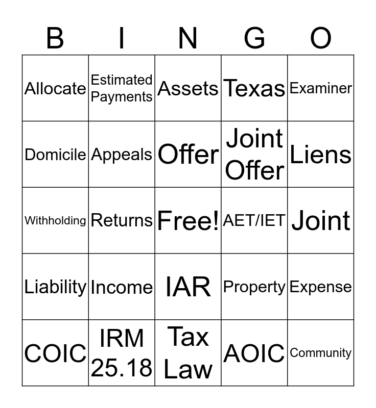 This bingo card has a free space and 24 words: Income, IRM 25.18, Offer, COIC, Examiner, Allocate, Domicile, Estimated Payments, AET/IET, IAR, Joint Offer, Withholding, Property, Expense, Appeals, AOIC, Joint, Assets, Liens, Returns, Community, Liability, Texas and Tax Law.