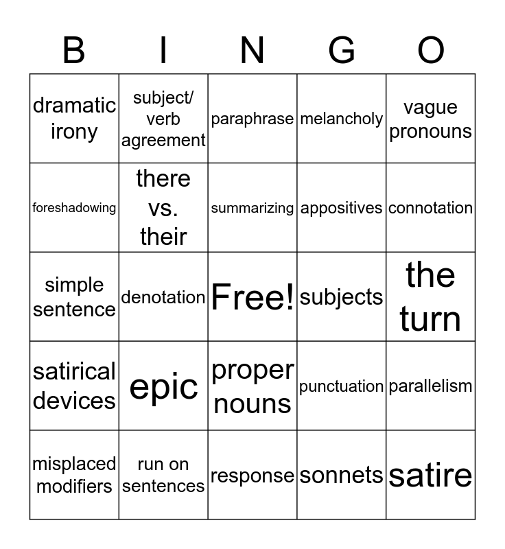 This bingo card has a free space and 24 words: epic, run on sentences, summarizing, misplaced modifiers, vague pronouns, dramatic irony, foreshadowing, subject/ verb agreement, subjects, proper nouns, appositives, simple sentence, punctuation, parallelism, there vs. their, sonnets, the turn, paraphrase, connotation, denotation, satire, satirical devices, melancholy and response.
