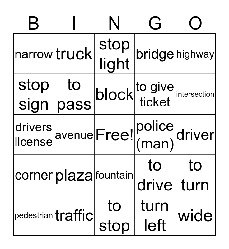 This bingo card has a free space and 24 words: plaza, traffic, block, pedestrian, highway, narrow, stop sign, truck, police (man), fountain, to give ticket, drivers license, to drive, to turn, to pass, turn left, driver, stop light, intersection, avenue, wide, corner, bridge and to stop.