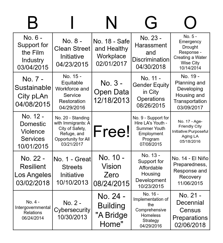 This bingo card has a free space and 24 words: No. 1 - Great Streets Initiative 10/10/2013, No. 2 - Cybersecurity 10/30/2013, No. 3 - Open Data 12/18/2013, No. 4 - Intergovernmental Relations 06/24/2014, No. 5 - Emergency Drought Response - Creating a Water Wise City 10/14/2014, No. 6 - Support for the Film Industry 03/04/2015, No. 7 - Sustainable City pLAn 04/08/2015, No. 8 - Clean Street Initiative 04/23/2015, No. 9 - Support for Hire LA's Youth - Summer Youth Employment Program 07/08/2015, No. 10 - Vision Zero 08/24/2015, No. 11 - Gender Equity in City Operations 08/26/2015, No. 12 - Domestic Violence Services 10/01/2015, No. 13 - Support for Affordable Housing Development 10/23/2015, No. 14 - El Niño Preparedness, Response and Recovery 11/06/2015, No. 15 - Equitable Workforce and Service Restoration 04/29/2016, No. 16 - Implementation of the Comprehensive Homeless Strategy 04/29/2016, No. 17 - Age-Friendly City Initiative:Purposeful Aging LA 05/18/2016, No. 18 - Safe and Healthy Workplace 02/01/2017, No. 19 - Planning and Developing Housing and Transportation 03/09/2017, No. 20 - Standing with Immigrants: A City of Safety, Refuge, and Opportunity for All 03/21/2017, No. 21 - Decennial Census Preparations 02/06/2018, No. 22 - Resilient Los Angeles 03/02/2018, No. 23 - Harassment and Discrimination 04/30/2018 and No. 24 - Building "A Bridge Home".