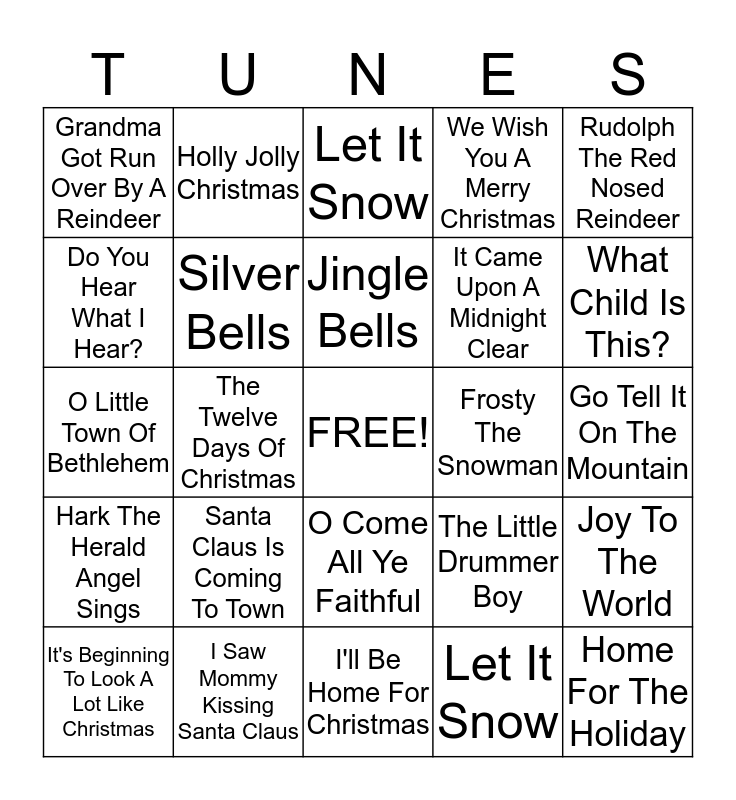 This bingo card has a free space and 24 words: Santa Claus Is Coming To Town, I Saw Mommy Kissing Santa Claus, Jingle Bells, It's Beginning To Look A Lot Like Christmas, Rudolph The Red Nosed Reindeer, Grandma Got Run Over By A Reindeer, Do You Hear What I Hear?, Holly Jolly Christmas, Frosty The Snowman, O Come All Ye Faithful, It Came Upon A Midnight Clear, O Little Town Of Bethlehem, The Little Drummer Boy, Joy To The World, Silver Bells, Let It Snow, Go Tell It On The Mountain, Let It Snow, What Child Is This?, The Twelve Days Of Christmas, Home For The Holiday, Hark The Herald Angel Sings, We Wish You A Merry Christmas and I'll Be Home For Christmas.