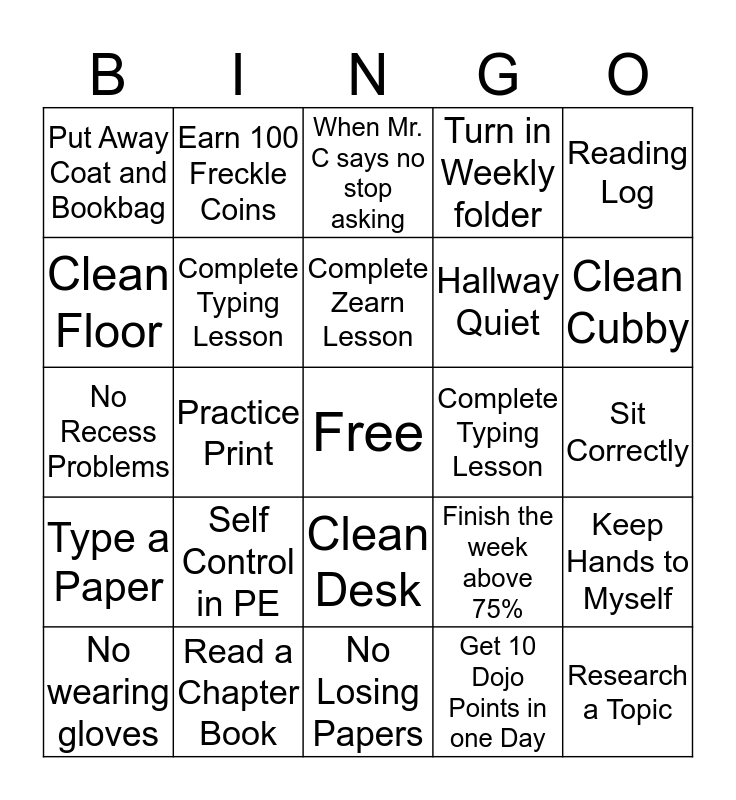 This bingo card has a free space and 24 words: Self Control in PE, Read a Chapter Book, Complete Zearn Lesson, No wearing gloves, Reading Log, Put Away Coat and Bookbag, Clean Floor, Earn 100 Freckle Coins, Complete Typing Lesson, Clean Desk, Hallway Quiet, No Recess Problems, Finish the week above 75%, Keep Hands to Myself, Complete Typing Lesson, Get 10 Dojo Points in one Day, Sit Correctly, When Mr. C says no stop asking, Clean Cubby, Practice Print, Research a Topic, Type a Paper, Turn in Weekly folder and No Losing Papers.