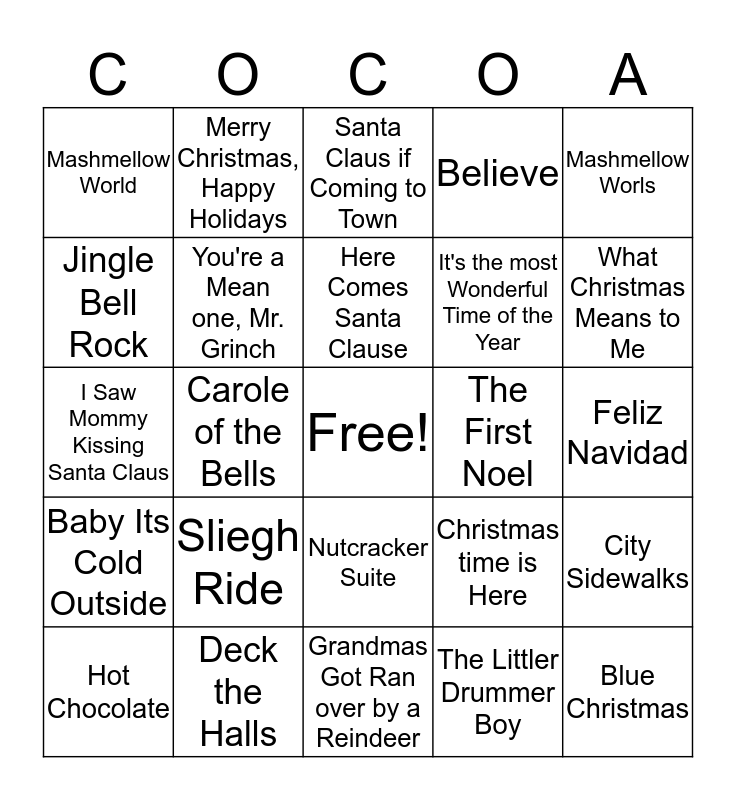 This bingo card has a free space and 34 words: All I want for Christmas is You, Mele Kalikimaka, I want a Hippopotamus for Christmas, Run Run Rudolph, Feliz Navidad, Jingle Bell Rock, You're a Mean one, Mr. Grinch, Grandmas Got Ran over by a Reindeer, It's the most Wonderful Time of the Year, Blue Christmas, I Saw Mommy Kissing Santa Claus, Merry Christmas, Happy Holidays, The Littler Drummer Boy, One Little Christmas Tree, Baby Its Cold Outside, Carole of the Bells, Nutcracker Suite, The First Noel, City Sidewalks, Hot Chocolate, Deck the Halls, Please Come home for Christmas, Believe, What Christmas Means to Me, Step into Christmas, Sliegh Ride, Santa Claus if Coming to Town, Santa Baby, Mashmellow Worls, Mashmellow World, Rockin Around the Christmas Tree, Here Comes Santa Clause, Christmas time is Here and White Christmas.