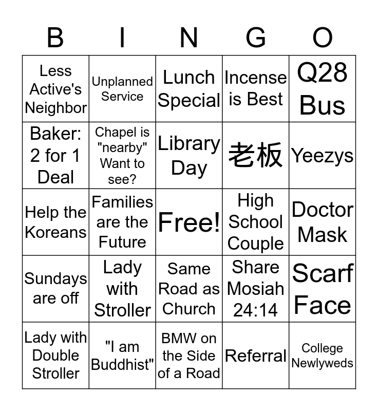 This bingo card has a free space and 24 words: Lady with Stroller, "I am Buddhist", Library Day, Lady with Double Stroller, Q28 Bus, Less Active's Neighbor, Baker: 2 for 1 Deal, Unplanned Service, High School Couple, Same Road as Church, 老板, Help the Koreans, Share Mosiah 24:14, Scarf Face, Chapel is "nearby" Want to see?, Referral, Doctor Mask, Lunch Special, Yeezys, Families are the Future, College Newlyweds, Sundays are off, Incense is Best and BMW on the Side of a Road.