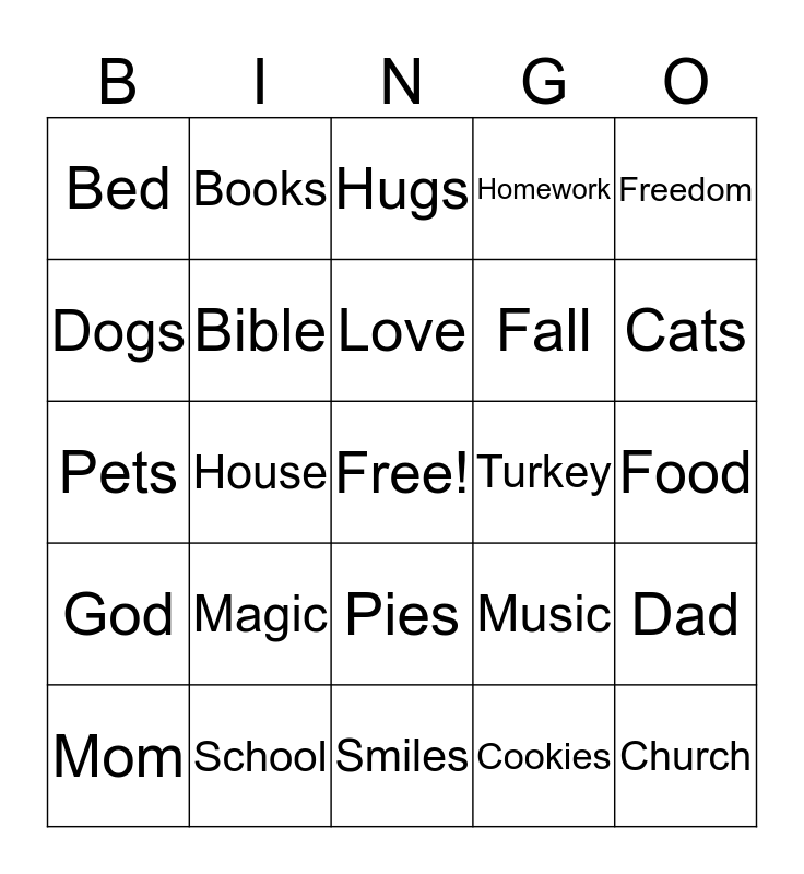 This bingo card has a free space and 24 words: Magic, School, Love, Mom, Freedom, Bed, Dogs, Books, Turkey, Pies, Fall, Pets, Music, Dad, Bible, Cookies, Food, Hugs, Cats, House, Church, God, Homework and Smiles.