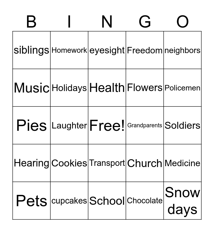 This bingo card has a free space and 24 words: Cookies, cupcakes, Health, Pets, neighbors, siblings, Music, Homework, Grandparents, Transport, Flowers, Pies, Church, Medicine, Holidays, Chocolate, Soldiers, eyesight, Policemen, Laughter, Snow days, Hearing, Freedom and School.