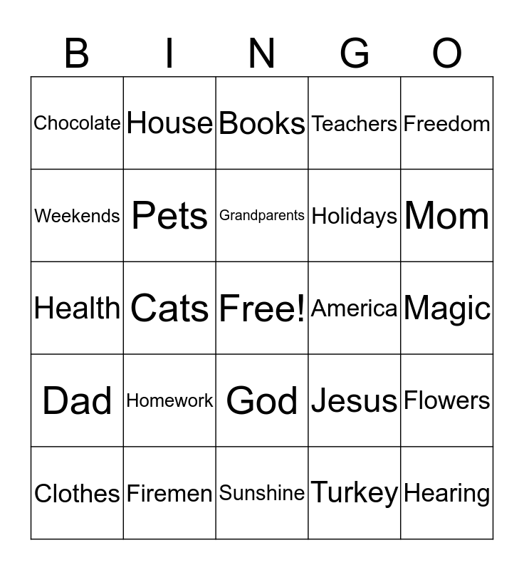 This bingo card has a free space and 24 words: Homework, Firemen, Grandparents, Clothes, Freedom, Chocolate, Weekends, House, America, God, Holidays, Health, Jesus, Flowers, Pets, Turkey, Magic, Books, Mom, Cats, Hearing, Dad, Teachers and Sunshine.