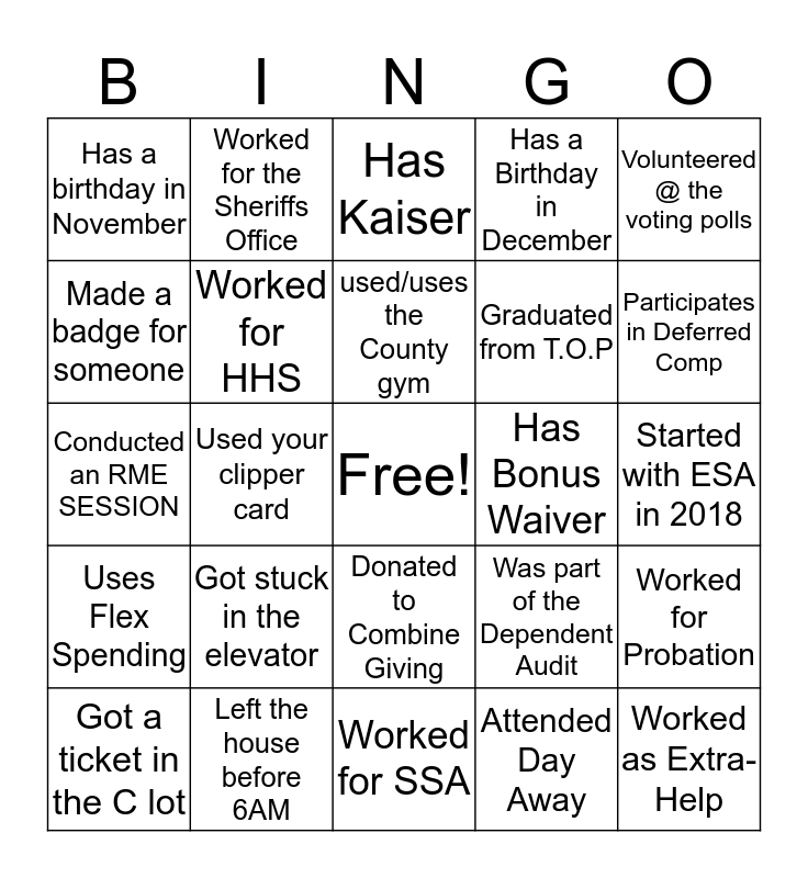 This bingo card has a free space and 24 words: Got stuck in the elevator, Left the house before 6AM, used/uses the County gym, Got a ticket in the C lot, Volunteered @ the voting polls, Has a birthday in November, Made a badge for someone, Worked for the Sheriffs Office, Has Bonus Waiver, Donated to Combine Giving, Graduated from T.O.P, Conducted an RME SESSION, Was part of the Dependent Audit, Worked for Probation, Worked for HHS, Attended Day Away, Started with ESA in 2018, Has Kaiser, Participates in Deferred Comp, Used your clipper card, Worked as Extra-Help, Uses Flex Spending, Has a Birthday in December and Worked for SSA.