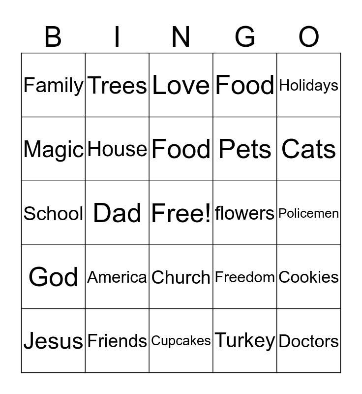 This bingo card has a free space and 24 words: America, Friends, Food, Jesus, Holidays, Family, Magic, Trees, flowers, Church, Pets, School, Freedom, Cookies, House, Turkey, Policemen, Love, Cats, Dad, Doctors, God, Food and Cupcakes.