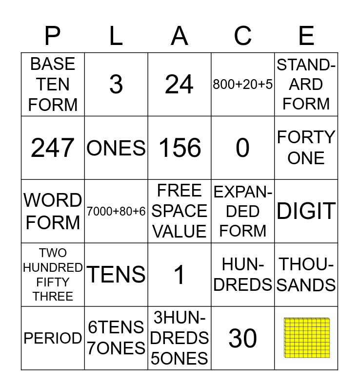This bingo card has 1 images, a free space and 23 words: PERIOD, TENS, 156, 30, STAND-ARD FORM, BASE TEN FORM, 3, 24, EXPAN-DED FORM, DIGIT, WORD FORM, ONES, HUN-DREDS, THOU-SANDS, 247, 6TENS 7ONES, 3HUN-DREDS 5ONES, 800+20+5, FORTY ONE, TWO HUNDRED FIFTY THREE, 7000+80+6, 1 and 0.