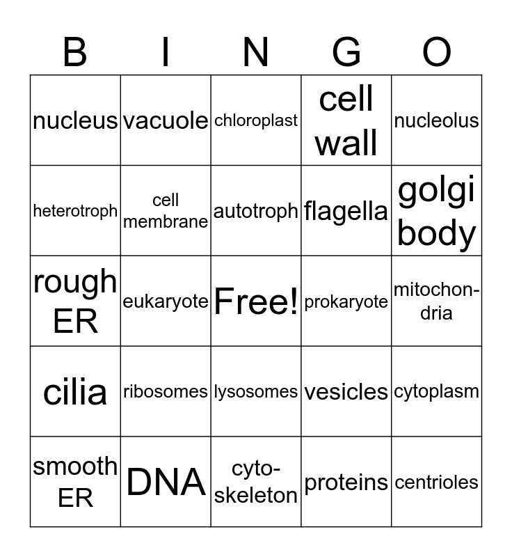 This bingo card has a free space and 24 words: ribosomes, DNA, autotroph, smooth ER, nucleolus, nucleus, heterotroph, vacuole, prokaryote, lysosomes, flagella, rough ER, vesicles, cytoplasm, cell membrane, proteins, mitochon-dria, chloroplast, golgi body, eukaryote, centrioles, cilia, cell wall and cyto-skeleton.