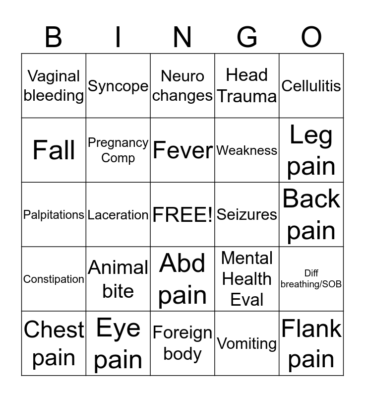 This bingo card has a free space and 29 words: Chest pain, MVC, Laceration, Multi Medical Complaints, Vaginal bleeding, Neuro changes, Pregnancy Comp, Animal bite, Seizures, Eye pain, Back pain, Flank pain, Foreign body, Vomiting, Leg pain, Urinary Freq., Abd pain, Constipation, Cellulitis, Palpitations, Mental Health Eval, Possible sepsis, Weakness, Fall, Head Trauma, Syncope, Diff breathing/SOB, Fever and Croup.