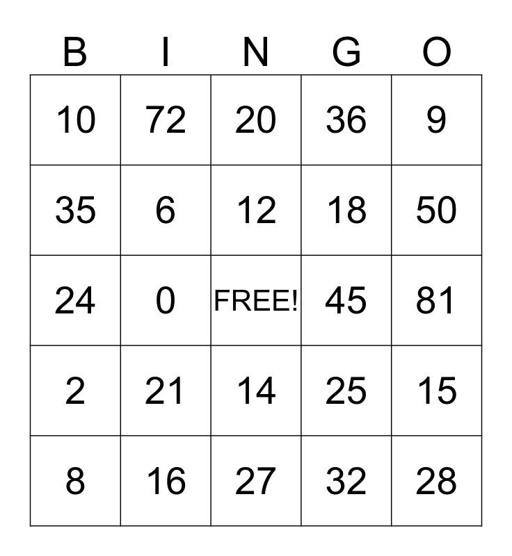 This bingo card has a free space and 24 words: 21, 16, 12, 8, 9, 10, 35, 72, 45, 14, 18, 24, 25, 15, 6, 32, 81, 20, 50, 0, 28, 2, 36 and 27.