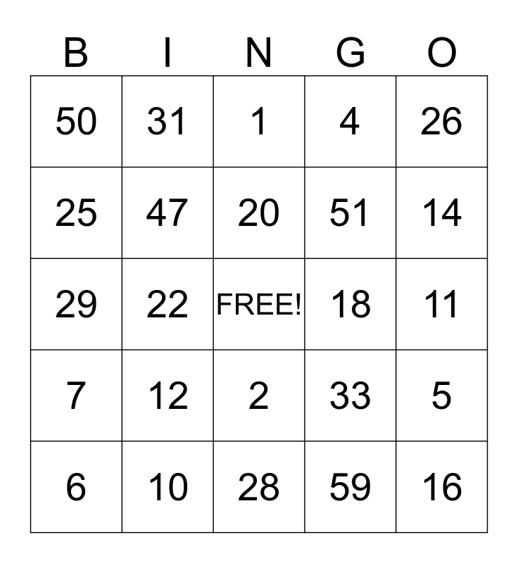 This bingo card has a free space and 24 words: 12, 10, 20, 6, 26, 50, 25, 31, 18, 2, 51, 29, 33, 5, 47, 59, 11, 1, 14, 22, 16, 7, 4 and 28.