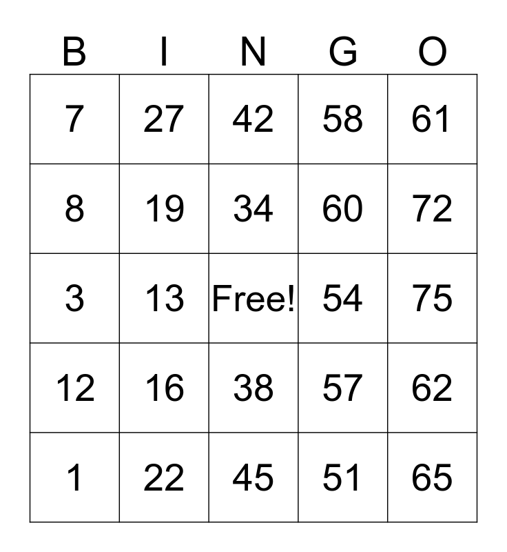This bingo card has a free space and 24 words: 1, 16, 34, 51, 61, 7, 27, 42, 54, 75, 3, 19, 57, 62, 8, 22, 45, 58, 72, 12, 13, 38, 60 and 65.