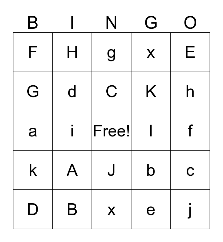 This bingo card has a free space and 24 words: A, B, C, D, E, F, G, H, I, J, K, a, b, c, d, e, f, g, h, i, j, k, x and x.