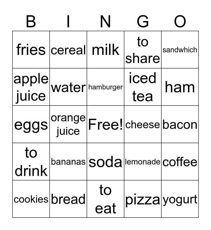 This bingo card has a free space and 24 words: bananas, bread, hamburger, cookies, sandwhich, fries, apple juice, cereal, cheese, soda, iced tea, eggs, lemonade, coffee, water, pizza, bacon, milk, ham, orange juice, yogurt, to drink, to share and to eat.