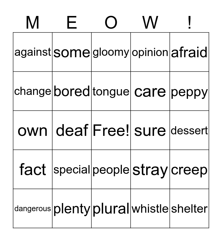 This bingo card has a free space and 24 words: special, plenty, tongue, dangerous, afraid, against, change, some, sure, people, care, own, stray, creep, bored, whistle, dessert, gloomy, peppy, deaf, shelter, fact, opinion and plural.