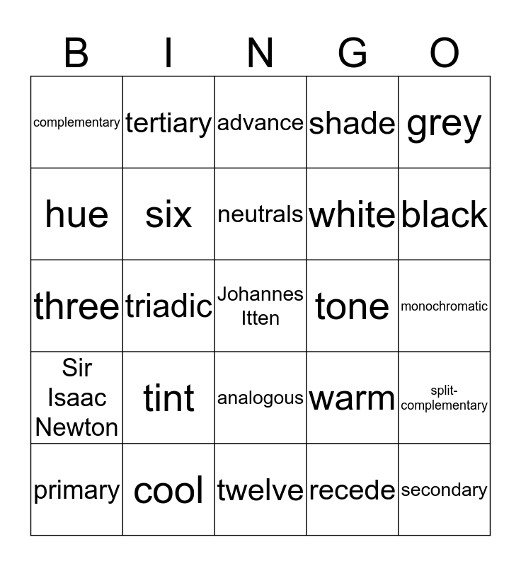 This bingo card has a free space and 24 words: tint, cool, neutrals, primary, grey, complementary, hue, tertiary, tone, analogous, white, three, warm, split-complementary, six, recede, monochromatic, advance, black, triadic, secondary, Sir Isaac Newton, shade and twelve.