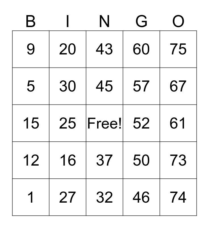 This bingo card has a free space and 24 words: 1, 16, 45, 46, 75, 9, 20, 43, 52, 61, 15, 30, 50, 73, 5, 27, 32, 60, 67, 12, 25, 37, 57 and 74.
