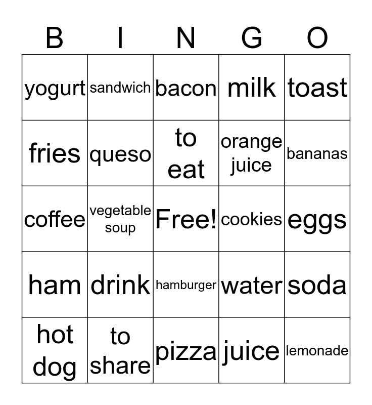 This bingo card has a free space and 24 words: drink, to share, to eat, hot dog, toast, yogurt, fries, sandwich, cookies, hamburger, orange juice, coffee, water, soda, queso, juice, eggs, bacon, bananas, vegetable soup, lemonade, ham, milk and pizza.