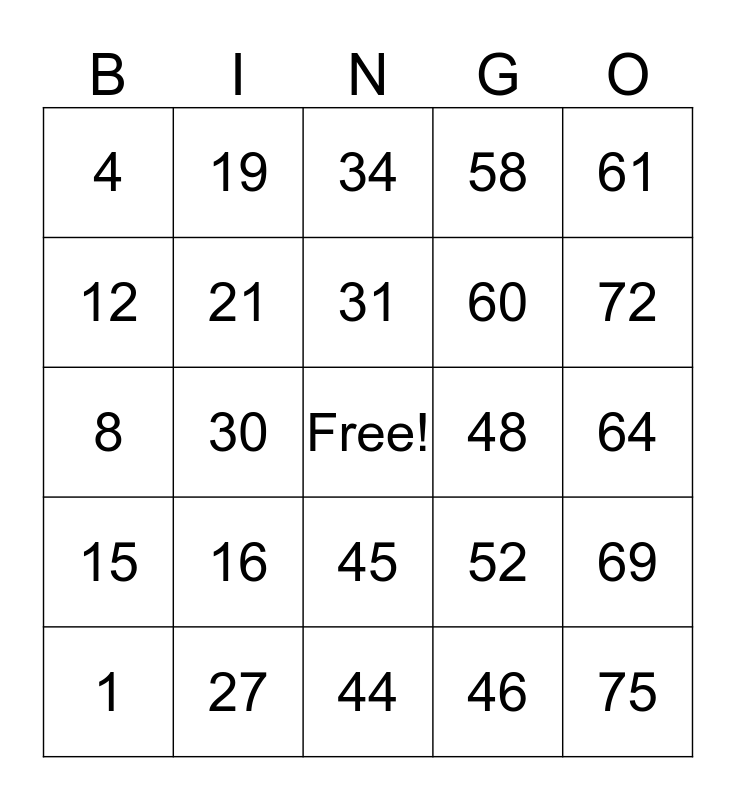This bingo card has a free space and 24 words: 1, 16, 31, 46, 61, 4, 19, 34, 48, 64, 8, 21, 52, 69, 12, 27, 44, 58, 72, 15, 30, 45, 60 and 75.