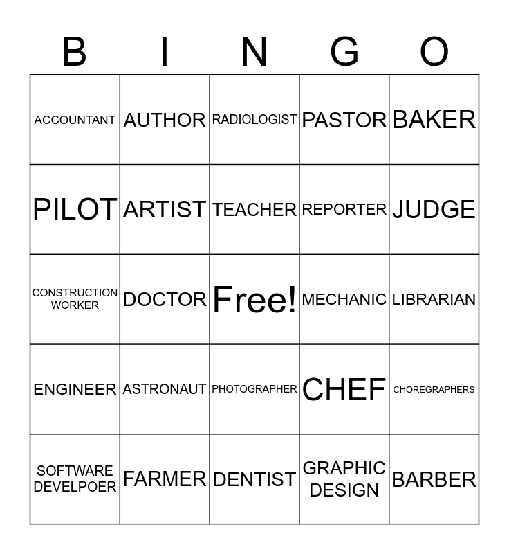 This bingo card has a free space and 34 words: ATHLETES, GRAPHIC DESIGN, FASHION DESIGNER, EMT, ENGINEER, ARTIST, BAKER, SOFTWARE DEVELPOER, AUTHOR, VETERINARIN, TEACHER, RADIOLOGIST, PRINCIPAL, MUSICIAN, MECHANIC, JUDGE, FARMER, CONSTRUCTION WORKER, ASTRONAUT, CHEF, PHOTOGRAPHER, NURSE, ACCOUNTANT, LIBRARIAN, DENTIST, BARBER, PASTOR, POLICE OFFICER, REPORTER, PILOT, LAWYER, DOCTOR, CHOREGRAPHERS and ENGINEER.