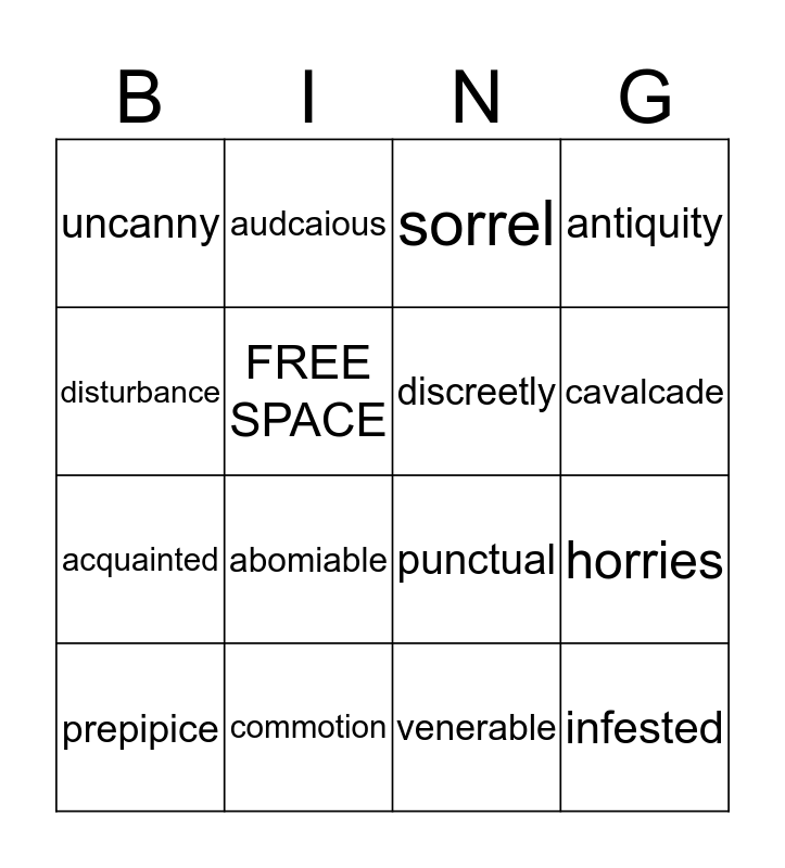 This bingo card has 16 words: commotion, horries, sorrel, uncanny, acquainted, audcaious, punctual, venerable, disturbance, FREE SPACE, prepipice, antiquity, abomiable, cavalcade, discreetly and infested.