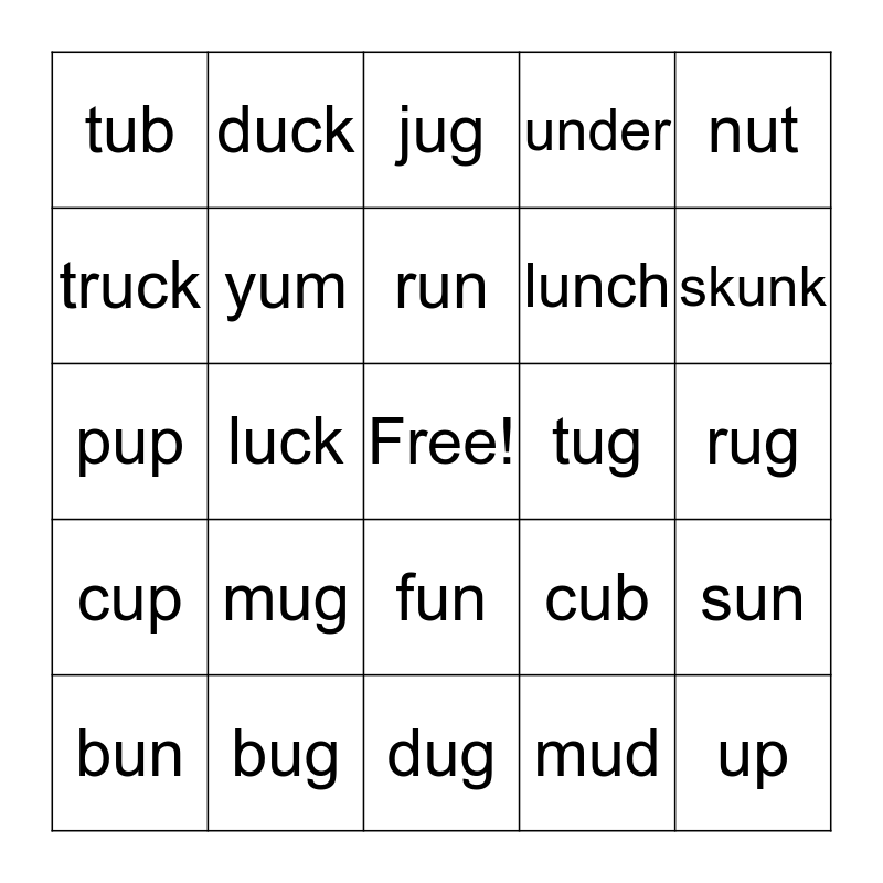 This bingo card has a free space and 24 words: mug, bug, run, bun, nut, tub, truck, duck, tug, fun, lunch, pup, cub, sun, yum, mud, rug, jug, skunk, luck, up, cup, under and dug.