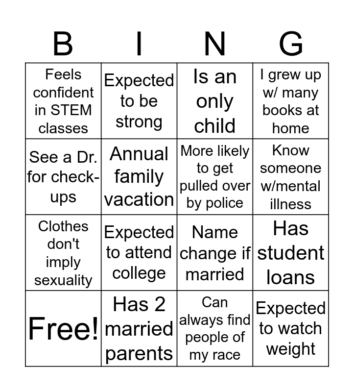 This bingo card has 16 words: Has 2 married parents, Has student loans, Is an only child, Feels confident in STEM classes, Clothes don't imply sexuality, Expected to be strong, Name change if married, Can always find people of my race, See a Dr. for check-ups, Annual family vacation, Free!, I grew up w/ many books at home, Expected to attend college, Know someone w/mental illness, More likely to get pulled over by police and Expected to watch weight.
