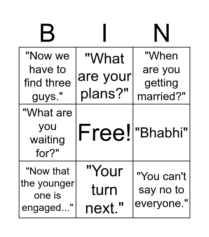 This bingo card has a free space and 8 words: "Bhabhi", "When are you getting married?", "What are your plans?", "Now that the younger one is engaged...", "Now we have to find three guys.", "You can't say no to everyone.", "What are you waiting for?" and "Your turn next.".
