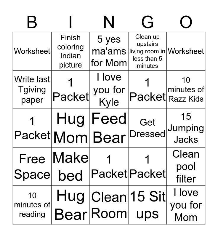 This bingo card has 25 words: Make bed, Clean Room, I love you for Kyle, 10 minutes of reading, Worksheet, Worksheet, Write last Tgiving paper, Finish coloring Indian picture, Get Dressed, 1 Packet, 1 Packet, 1 Packet, 1 Packet, Clean pool filter, 1 Packet, I love you for Mom, 15 Jumping Jacks, 5 yes ma'ams for Mom, 10 minutes of Razz Kids, Hug Mom, Feed Bear, Hug Bear, Free Space, Clean up upstairs living room in less than 5 minutes and 15 Sit ups.