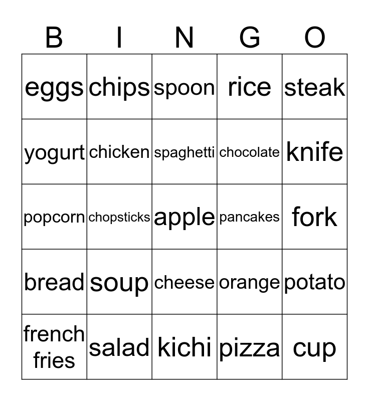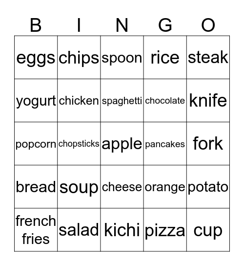 This bingo card has a free space and 24 words: soup, salad, spaghetti, french fries, steak, eggs, yogurt, chips, pancakes, cheese, chocolate, popcorn, orange, potato, chicken, pizza, fork, spoon, knife, chopsticks, cup, bread, rice and kichi.