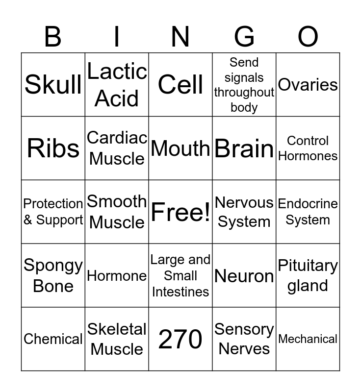This bingo card has a free space and 37 words: Skeletal System, Muscular System, Digestive System, Nervous System, Endocrine System, Spongy Bone, Smooth Muscle, Stomach, Brain, Thyroid, Ribs, Cardiac Muscle, Sensory Nerves, Ovaries, Skull, Skeletal Muscle, Large and Small Intestines, Send signals throughout body, Control Hormones, Protection & Support, Lactic Acid, Mouth, Spinal Cord, Pituitary gland, Anatomy, Phyisiology, Cell, Tissue, Organ, Organ System, 206, 270, Neuron, Mechanical, Chemical, Hormone and Signal.