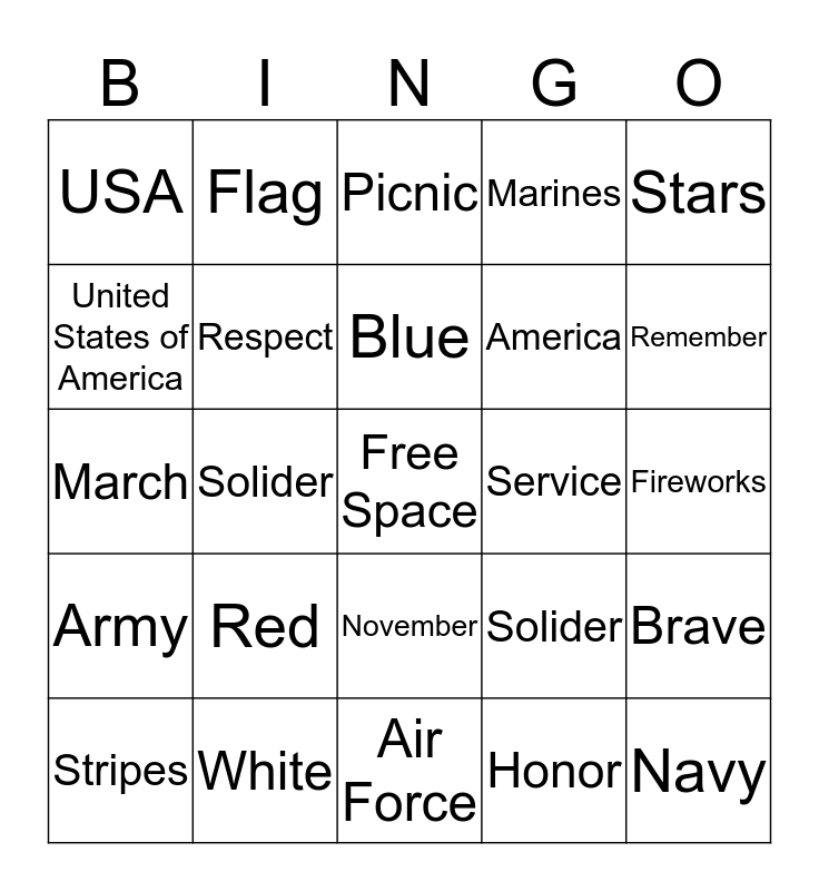 This bingo card has a free space and 24 words: Red, White, Blue, Stripes, Stars, USA, United States of America, Flag, Service, November, America, March, Solider, Brave, Respect, Honor, Fireworks, Picnic, Remember, Solider, Navy, Army, Marines and Air Force.