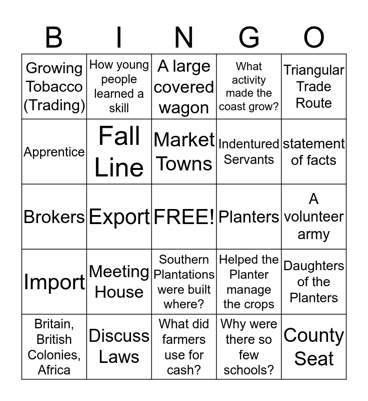 This bingo card has a free space and 24 words: Meeting House, Discuss Laws, Market Towns, Britain, British Colonies, Africa, Triangular Trade Route, Growing Tobacco (Trading), Apprentice, How young people learned a skill, Planters, Southern Plantations were built where?, Indentured Servants, Brokers, Helped the Planter manage the crops, Daughters of the Planters, Fall Line, Why were there so few schools?, A volunteer army, A large covered wagon, statement of facts, Export, County Seat, Import, What activity made the coast grow? and What did farmers use for cash?.