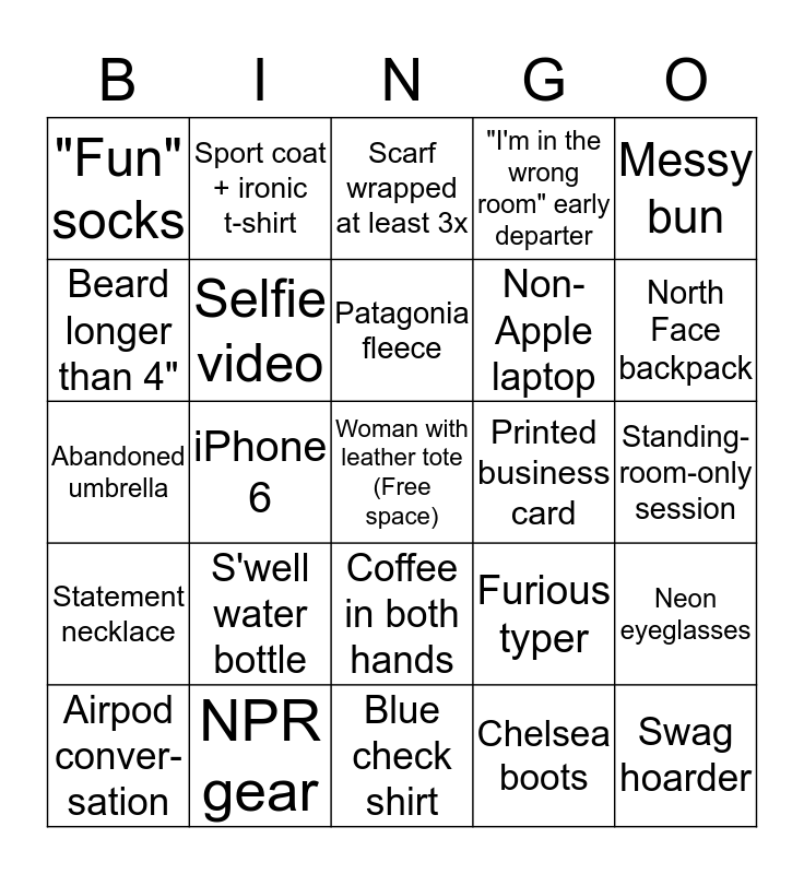 This bingo card has a free space and 24 words: S'well water bottle, NPR gear, Patagonia fleece, Airpod conver- sation, Messy bun, "Fun" socks, Beard longer than 4", Sport coat + ironic t-shirt, Printed business card, Coffee in both hands, Non-Apple laptop, Abandoned umbrella, Furious typer, Neon eyeglasses, Selfie video, Chelsea boots, Standing-room-only session, Scarf wrapped at least 3x, North Face backpack, iPhone 6, Swag hoarder, Statement necklace, "I'm in the wrong room" early departer and Blue check shirt.
