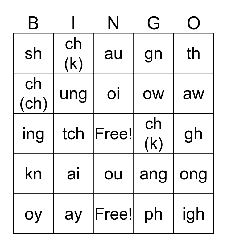 This bingo card has a free space and 24 words: ai, ay, oi, oy, th, sh, ch (ch), ch (k), ch (k), ou, ow, ing, ang, ong, ung, ph, gh, au, aw, tch, igh, kn, gn and Free!.