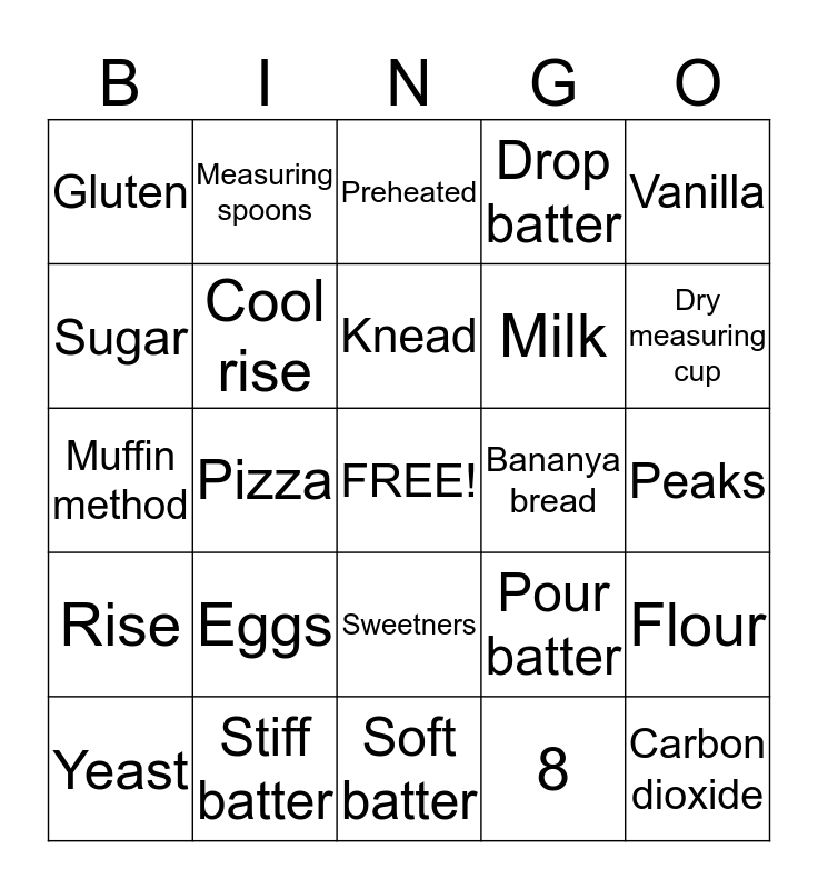 This bingo card has a free space and 24 words: Eggs, Stiff batter, Knead, Yeast, Vanilla, Gluten, Sugar, Measuring spoons, Bananya bread, Sweetners, Milk, Muffin method, Pour batter, Flour, Cool rise, 8, Peaks, Preheated, Dry measuring cup, Pizza, Carbon dioxide, Rise, Drop batter and Soft batter.