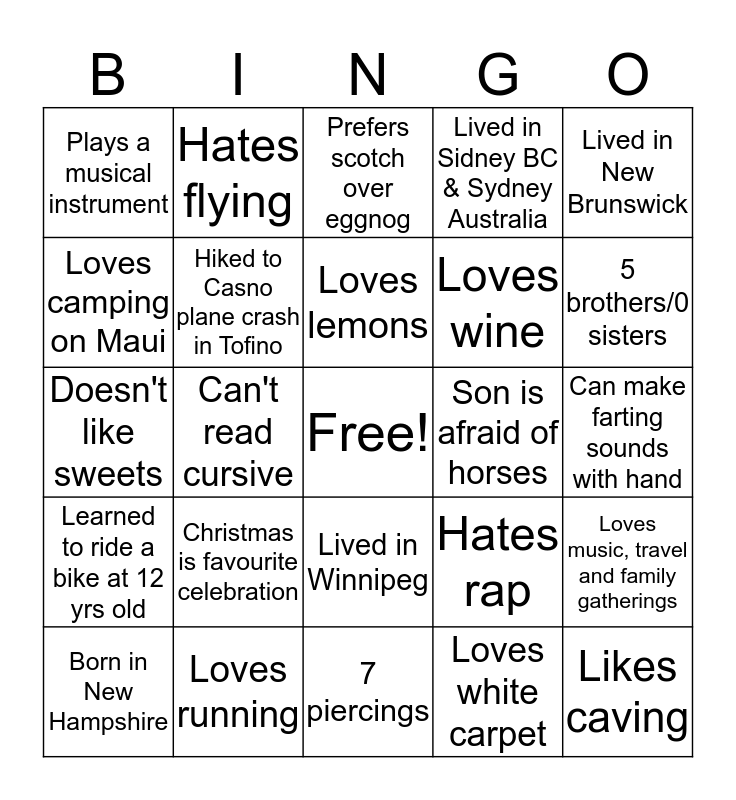 This bingo card has a free space and 31 words: 7 piercings, Can't tell time on analog watch, Can't read cursive, Track scholarship, Plays a musical instrument, Prefers scotch over eggnog, Hiked to Casno plane crash in Tofino, Hates rap, Son is afraid of horses, Loves white carpet, Can make farting sounds with hand, Likes caving, Ella habla espanol cuando viaja, Raise on VI and in Saskatchewan, 5 brothers/0 sisters, Holds HUGE dance parties semi-regularly, Loves music, travel and family gatherings, Christmas is favourite celebration, Learned to ride a bike at 12 yrs old, Lived in Winnipeg, Lived in New Brunswick, From Vermont, Born in New Hampshire, Hates flying, Loves wine, Loves camping on Maui, Lived in Sidney BC & Sydney Australia, Doesn't like sweets, Loves running, Loves lemons and Speaks 5 languages.