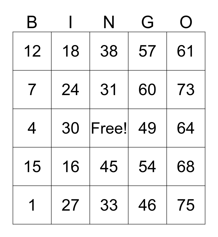 This bingo card has a free space and 24 words: 1, 16, 31, 46, 61, 12, 18, 38, 49, 64, 4, 24, 54, 68, 7, 27, 33, 57, 73, 15, 30, 45, 60 and 75.