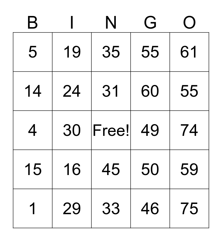 This bingo card has a free space and 24 words: 1, 16, 31, 46, 61, 5, 19, 35, 49, 74, 4, 24, 50, 59, 14, 29, 33, 55, 55, 15, 30, 45, 60 and 75.