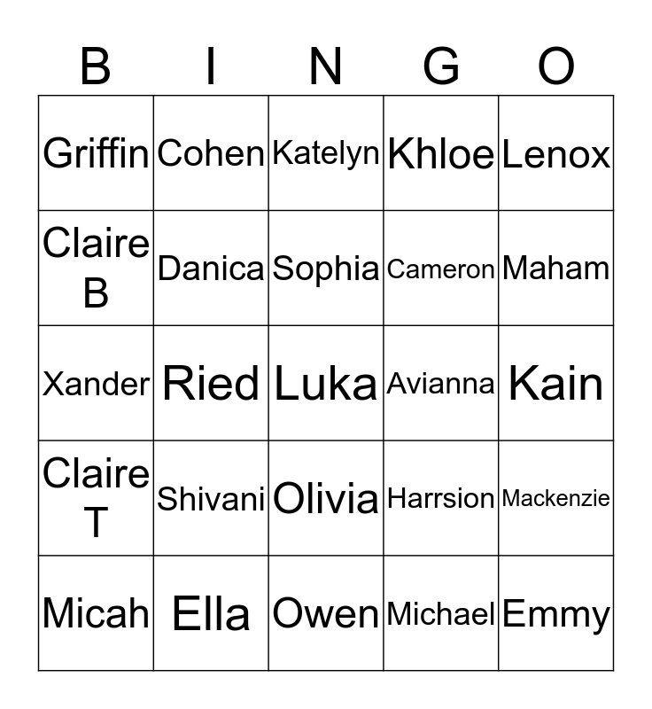 This bingo card has a free space and 27 words: Harrsion, Blayne, Cameron, Owen, Claire B, Katelyn, Cohen, Claire T, Avianna, Mackenzie, Xander, Khloe, Micah, Ella, Maham, Molly, Danica, Sophia, Shivani, Griffin, Kain, Michael, Ried, Emmy, Olivia, Lenox and Ezaan.