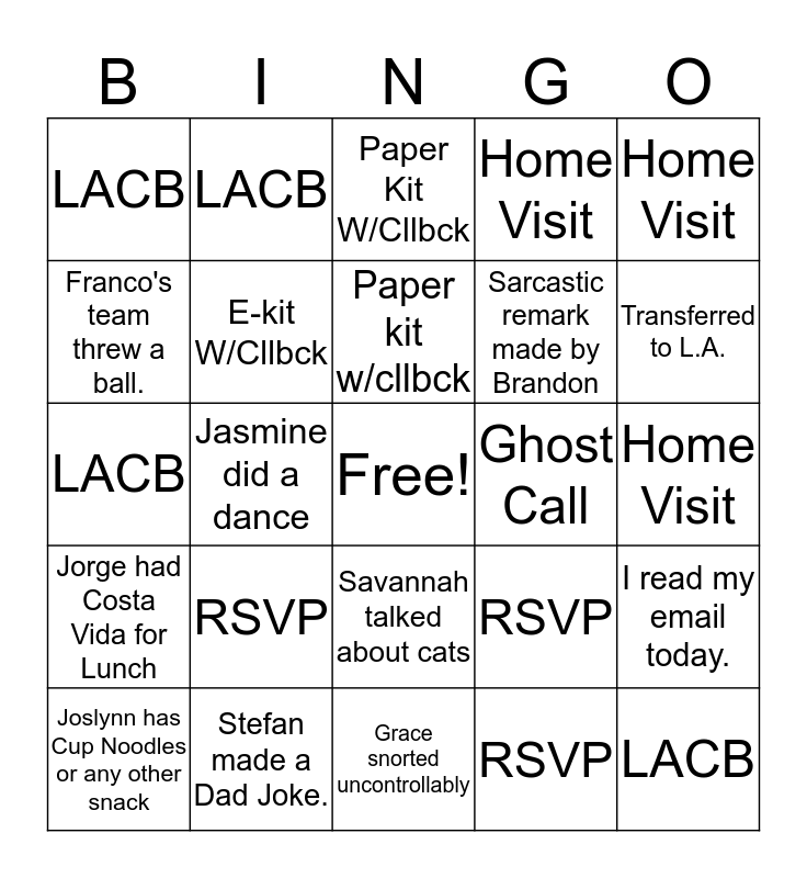 This bingo card has a free space and 29 words: Joslynn has Cup Noodles or any other snack, Jasmine came to bother Jorge, Jasmine did a dance, HV, LACB, Paper Kit W/Cllbck, E-kit W/Cllbck, RSVP, Ghost Call, Stefan made a Dad Joke., Home Visit, LACB, Grace snorted uncontrollably, RSVP, Transferred to L.A., 100% QA, Savannah talked about cats, Jorge had Costa Vida for Lunch, Home Visit, LACB, RSVP, Unexpected Disconnect, Sarcastic remark made by Brandon, Franco's team threw a ball., Home Visit, LACB, I read my email today., Paper kit w/cllbck and E-kit w/cllbck.